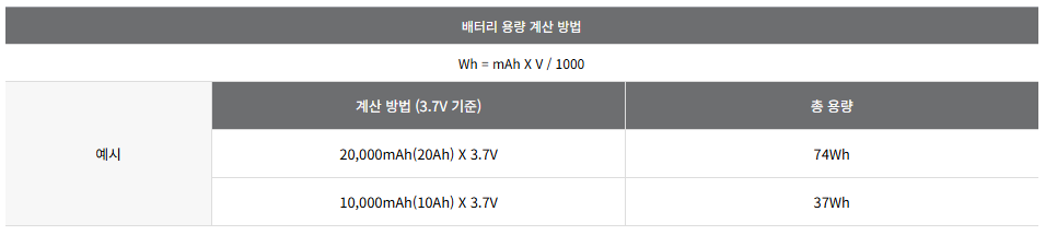 ✅ 보조배터리 용량이 160Wh를 초과하지 않는지 확인