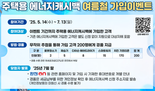 참여 기간은 2025년 5월 14일부터 7월 13일까지이며, 이 기간 동안 에너지 사용량을 줄인 고객 중 200명을 추첨하여 다양한 경품을 제공합니다. 경품으로는 로봇 청소기, 스마트워치 등 유용한 아이템이 포함되어 있습니다. 이벤트에 대한 자세한 내용은 아래의 포스터를 참고하시기 바랍니다.