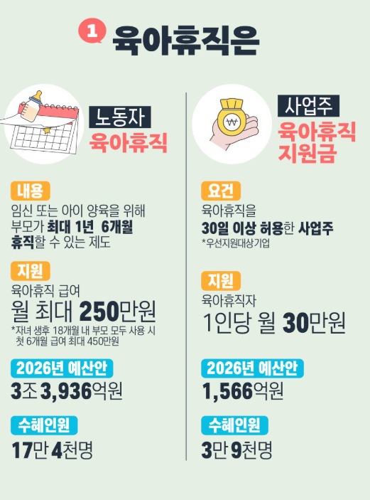 2026년에는 육아휴직 급여 상한 크게 인상, 급여 전액 지급, 육아휴직 기간 확대, 그리고 부모 함께 사용 시 추가 인센티브 확대 등 다양한 제도 개선이 이루어졌습니다.
